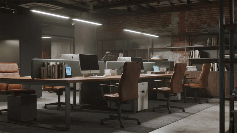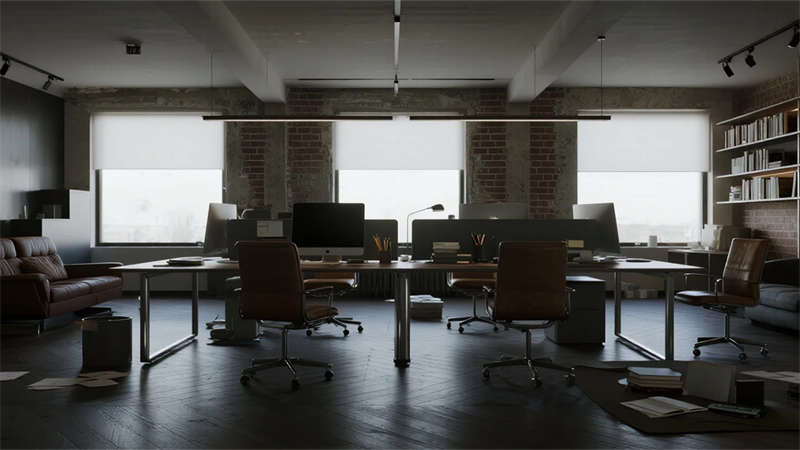 这组工业风办公室设计以裸露结构和复古质感为核心,通过混凝土、金属和木质材料的碰撞,打造出兼具实用性与艺术感的办公空间。空间保留了建筑的原始肌理,如天花板的管线和墙面的砖纹,搭配黑色铁艺家具和深色调软装,营造出冷峻而富有张力的氛围。局部通过皮质沙发、绿植和暖光灯具软化工业风的硬朗感,增添人文气息。