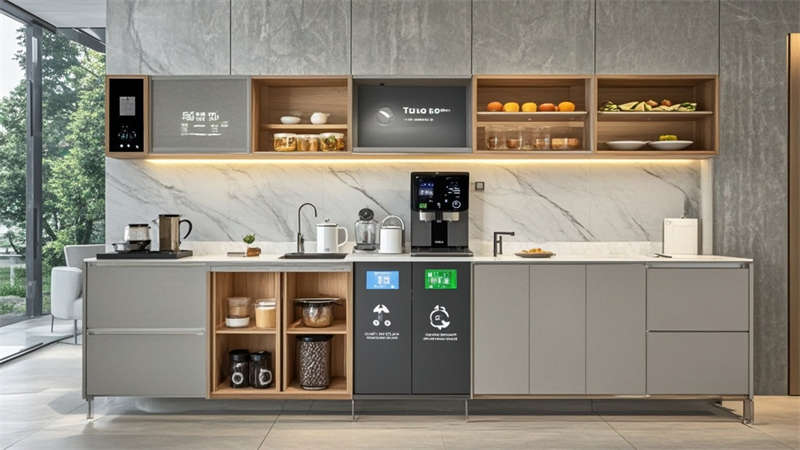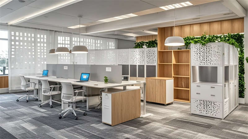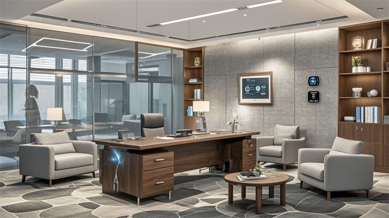 ④声学吊顶确保35分贝以下静音环境。色彩搭配采用70%浅灰奠定基调,20%原木色增添温暖,10%企业蓝作为点睛色。环保方面选用LEED认证材料,集成光伏玻璃幕墙年发电量达8万度。