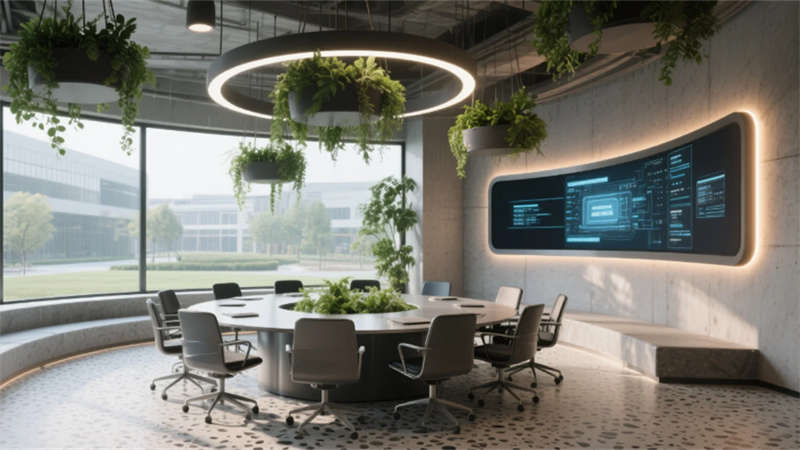 空间摒弃传统隔断,运用通透玻璃与可移动装置实现功能转换,阳光透过智能窗控系统洒入每个角落。材质与光影的精心编排,构建出兼具高效协作与人文关怀的现代办公生态,诠释创新企业的精神内核。
