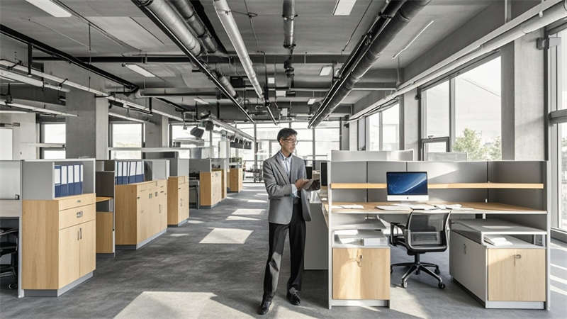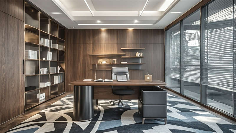 本1500㎡现代简约办公室设计以'高效协作·人文关怀'为核心,采用模块化空间布局提升使用弹性。主色调选用浅灰、白、木三色系,局部点缀企业深蓝色强化品牌认知。开放式办公区采用1.2m×1.8m标准工位模块,通过玻璃隔断实现90%自然光渗透率。智能照明系统根据日照强度自动调节色温,全年节电率达35%。核心筒改造区运用曲面木饰面弱化建筑结构,形成自然交流节点。声学设计方面,蜂窝吸音板(NRC 0.85)与隔音舱(STC 52)组合控制噪音污染。茶水区采用磁吸轨道插座系统,支持设备灵活接入。所有家具均符合WELL建筑标准,办公椅配备6向调节功能。通过BIM技术实现管线综合,保留3.2米净高营造开阔感。
