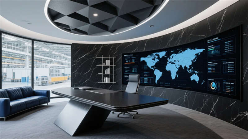 开放式办公区打破传统壁垒,蜂窝状工位与悬浮绿植装置诠释灵动协作,透明屏幕上的数据流与玻璃隔断投影的生产流程图虚实相映。总裁空间则如悬浮的智慧中枢,弧形落地窗将车间全景化作动态壁画,金属与大理石的碰撞间,流淌着决策与创新的电流。智能仓储区立体货架的金属骨骼间,无人机如蜂鸟般掠过货品,天光与电子标签的光斑在环氧地面上跳动着数字时代的韵律。
