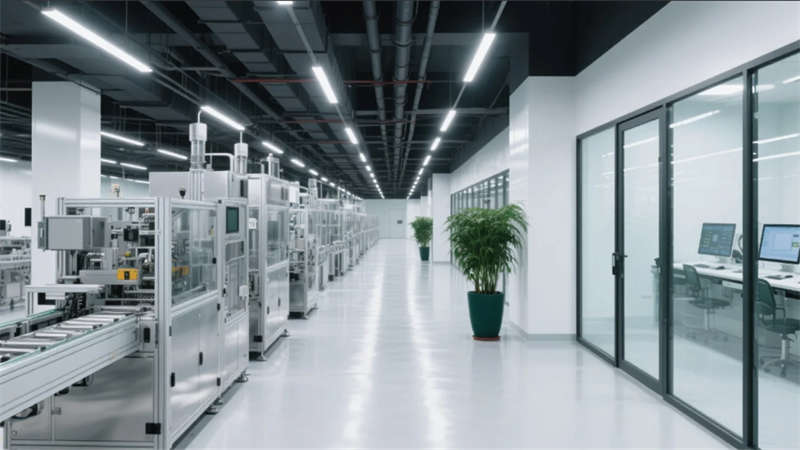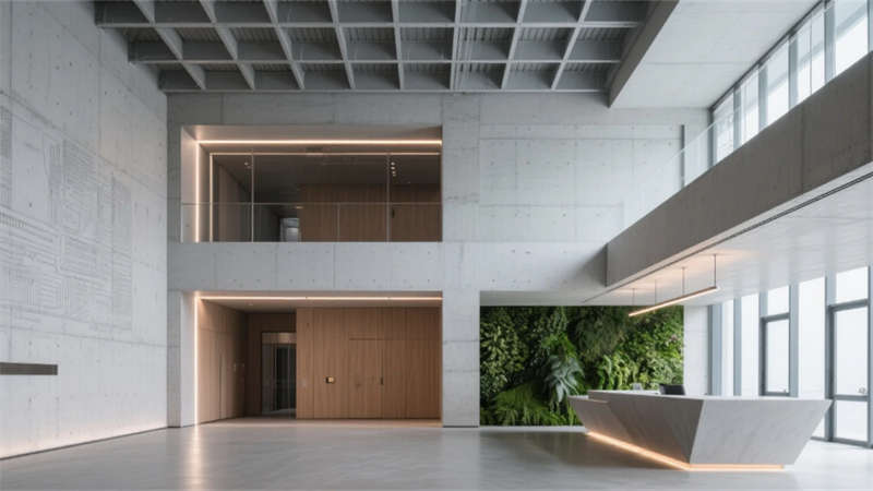 双层门厅以混凝土艺术墙奠定科技基调,延伸至通透的研发实验室,可重组实验模块激发创新协作。柔性动线设计让仓储中心与生产区无缝联动,AGV物流如血脉般精准穿梭。休憩庭院成为空间"呼吸节点",镜面水景倒映竹影,为高强度作业注入宁静能量。