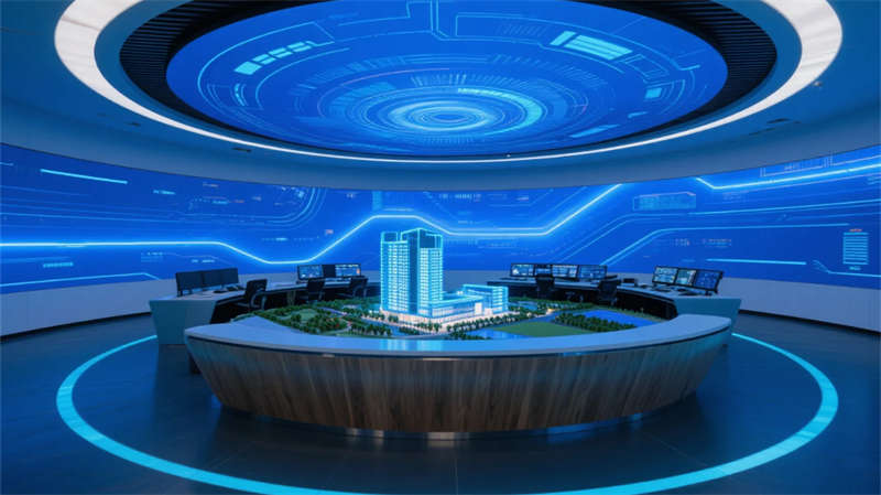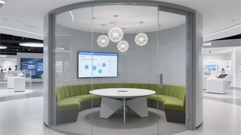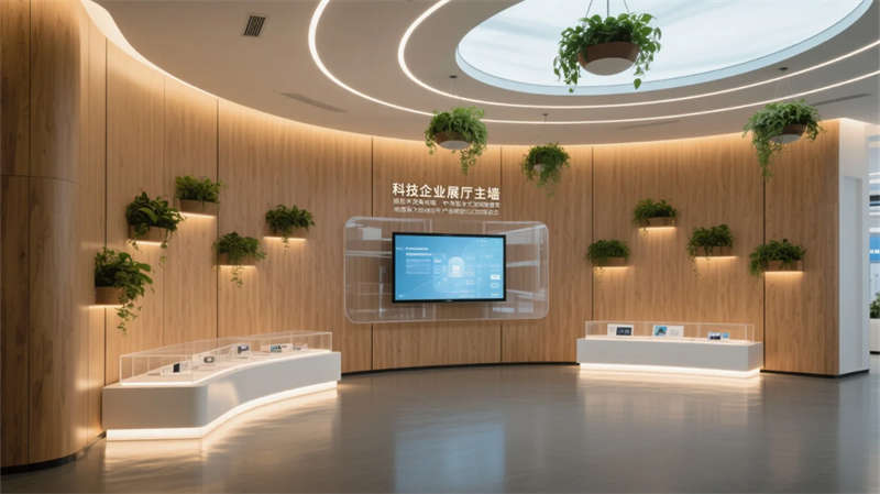 入口以光带引导与生态绿墙开启叙事,核心展区通过悬浮触控与嵌入式展台聚焦技术创新。数字沙盘区突破物理限制,以天地屏联动呈现发展蓝图;智能会议舱可随时转化为协作中枢,通透隔断维持空间对话性。文化长廊以光影步道承载企业精神,生态休憩区则借自然光影与苔藓景观构建减压绿洲。