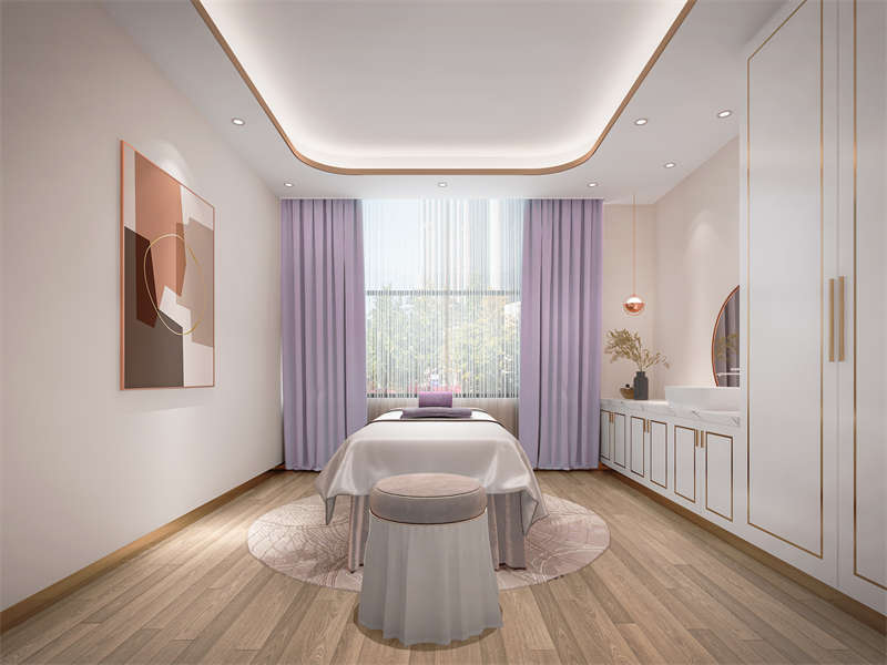 美容间,淡雅的色调与大面积留白,在视觉上体现出一种引导性和动感的体验,颇有动静怡然的空间气氛。